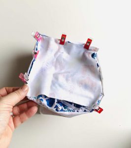 Nun steckst Du Außentasche in die auf links gewendete Innentasche, so dass die rechten Seiten der Taschen zueinander liegen.