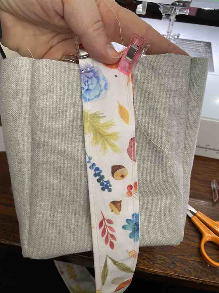 Den Streifen nähst Du an die rechte Seite der Futtertasche, genau mittig an eine der Seitenteile. Wiederhole den Schritt auf der gegenüberliegenden Taschenseite.