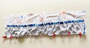 Du hast nun einen Tunnel. Fädel das Gummiband mithilfe einer Sicherheitsnadel durch den Tunnel. Fixiere das Gummiband am Anfang und Ende des Tunnels mit ein paar Stichen innerhalb der NZ, so dass das Gummiband nicht in den Tunnel rutscht.