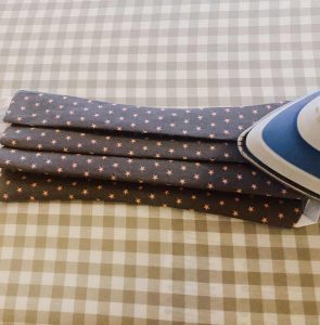 Wende die Maske durch die Öffnung auf die rechte Seite, forme die Ecken schön aus und bügle erstmal alles schön glatt.