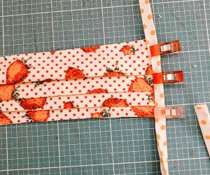 Klappe den Streifen auf und lege die schmale Seite der gefalteten Maske hinein. Klappe das Schrägband auf den Stoff und stecke es mit Klammern oder Stecknadeln fest.