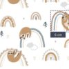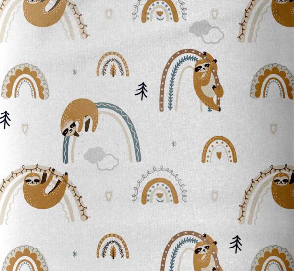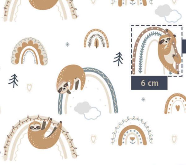 Baumwolljersey mit Digitaldruck Faultieren am Regenbogen auf cremefarbenem Grund.