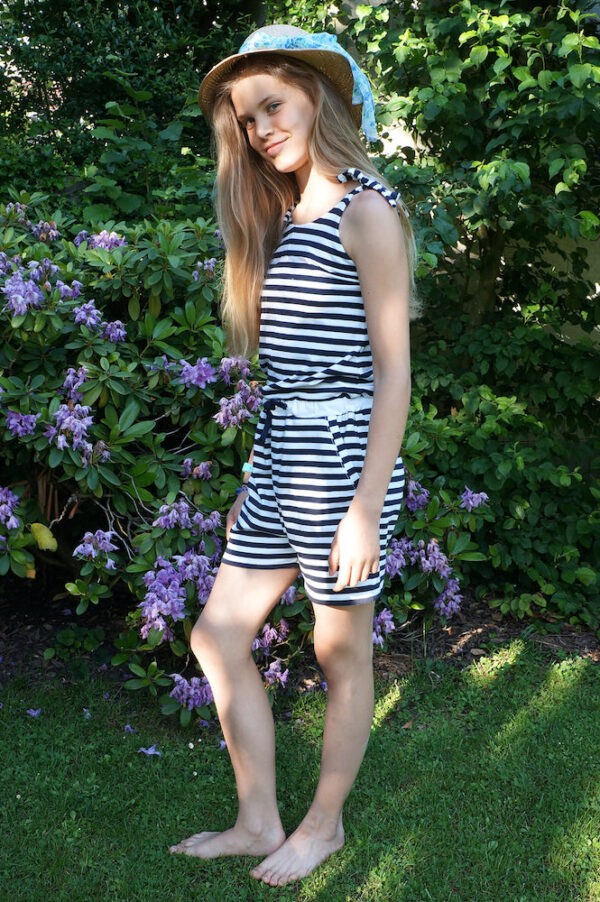 Der Jumpsuit LAHELA Mini hat einen relaxed Schnitt. Das macht zum Einen das An- und Ausziehen leichter, zum Anderen gibt es Dir die Möglichkeit, sowohl dehnbare als auch nicht dehnbare Stoffe zu verwenden.