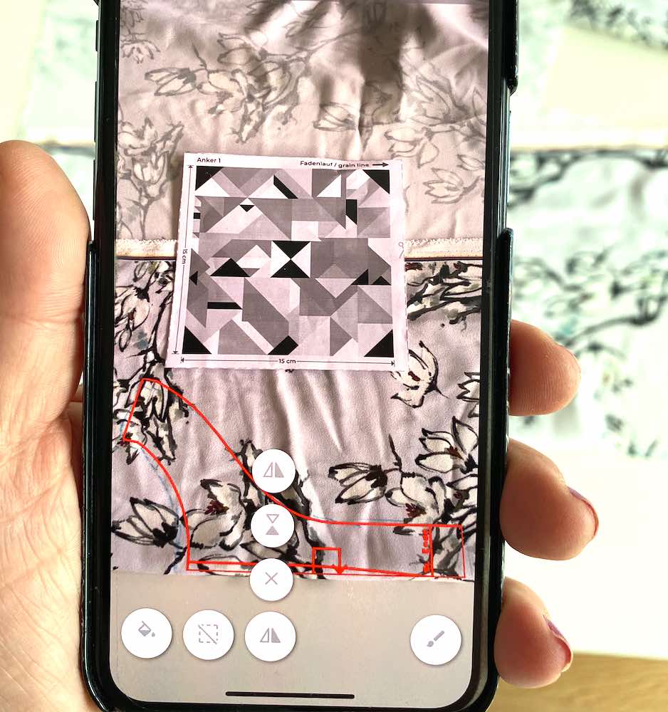 Ist dies der Fall erscheinen auf wundersame Weise plötzlich die Linien meines Schnittteiles auf meinem Stoff . Wie cool! Zugegeben, man braucht einen Moment um das Handy zu halten und mit dem Stift die Linien , die ich durch den Handybildschirm sehe, auf den Stoff zu übertragen.